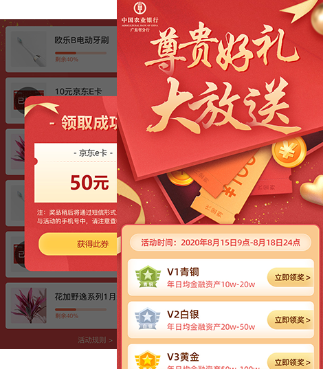 猫券权益解决方案平台为广东农行打造“尊贵好礼大放送”活动。广东农行理财级以上客户每月限定时间内登录掌银,进入“做农行商户,尊贵好礼”栏目即可参与抽奖活动。